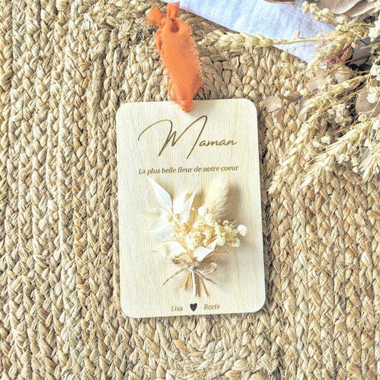Enveloppe bois et fleurs séchées personnalisée - Cadeau maman