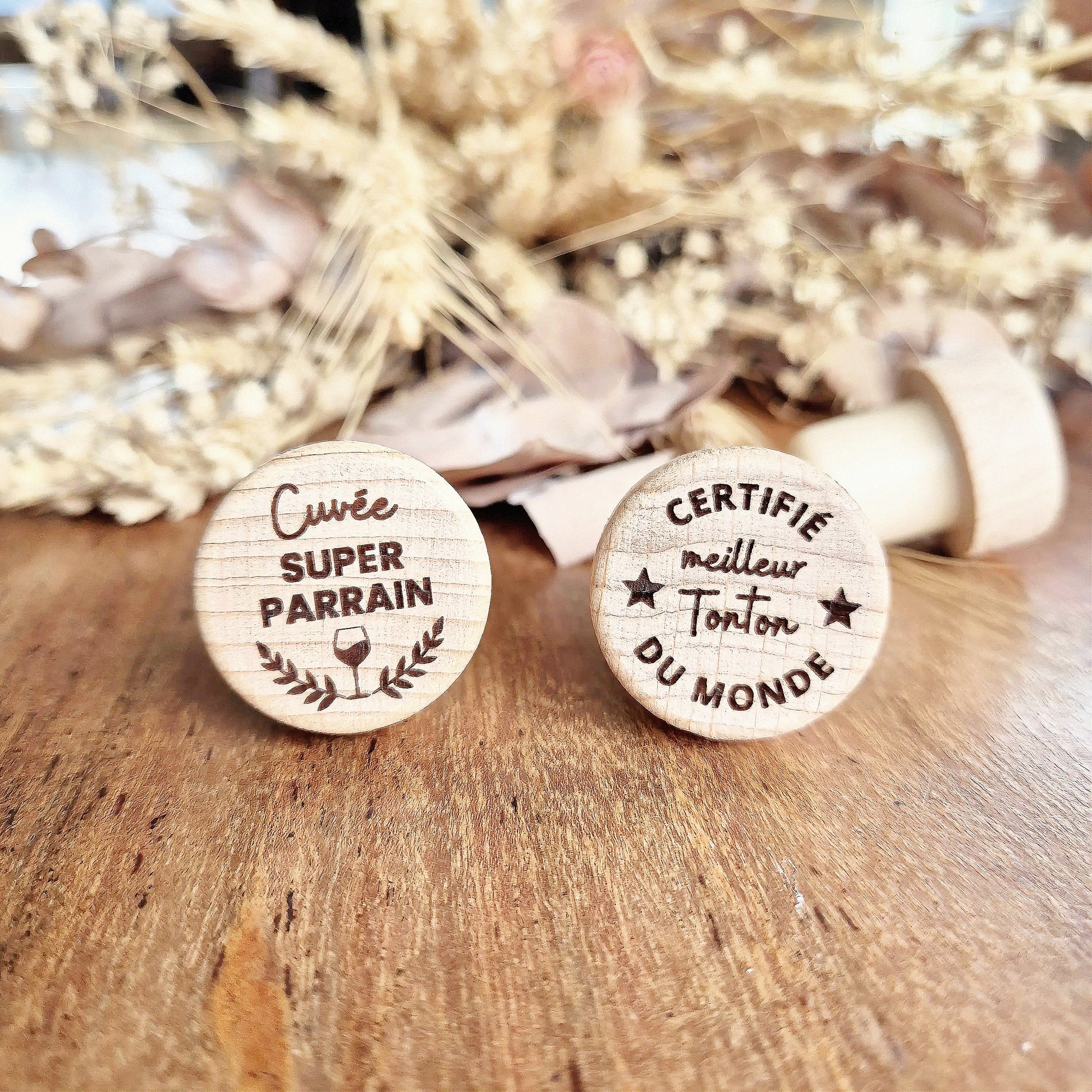 Bouchon de bouteille en bois réutilisable - Cadeau Parrain/Tonton