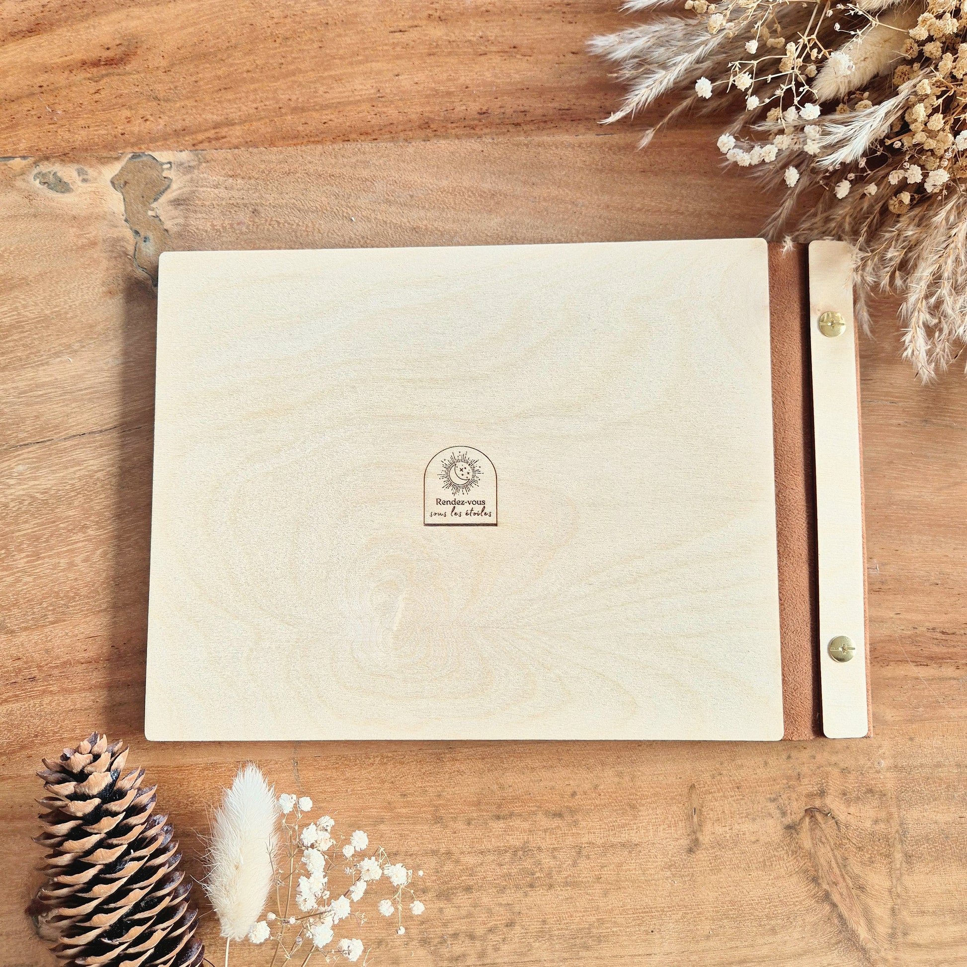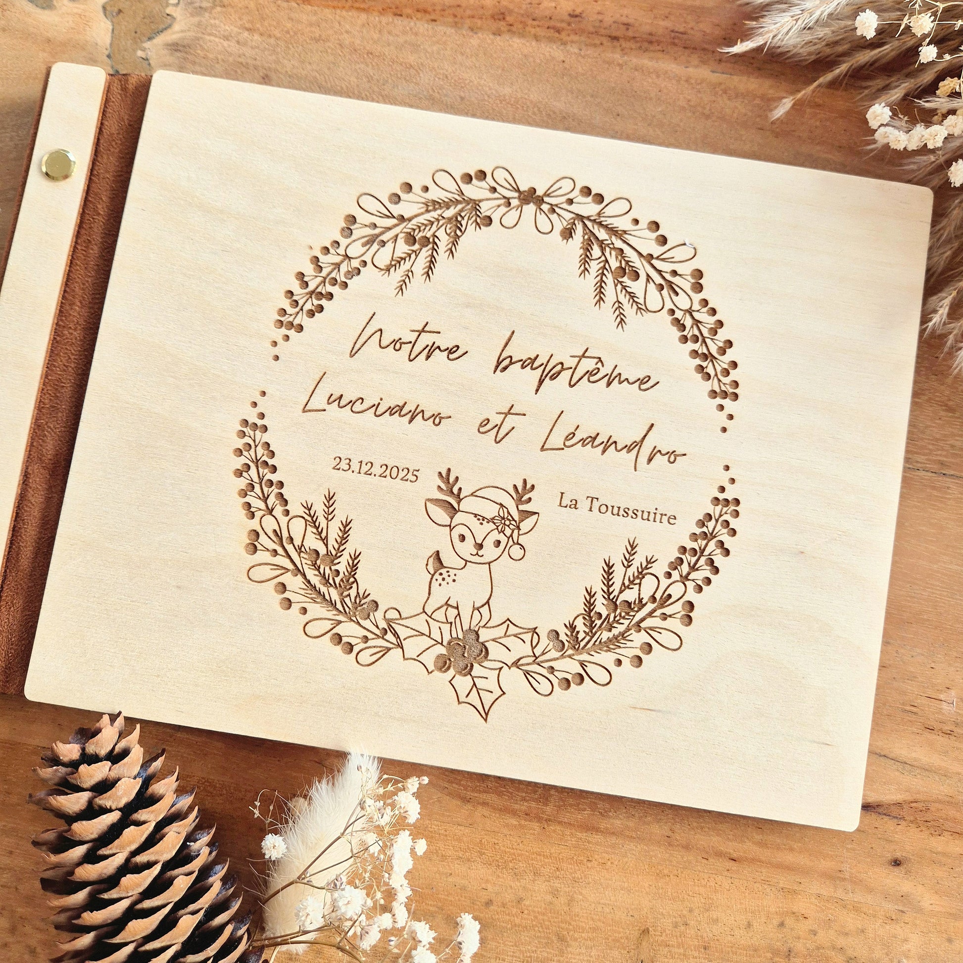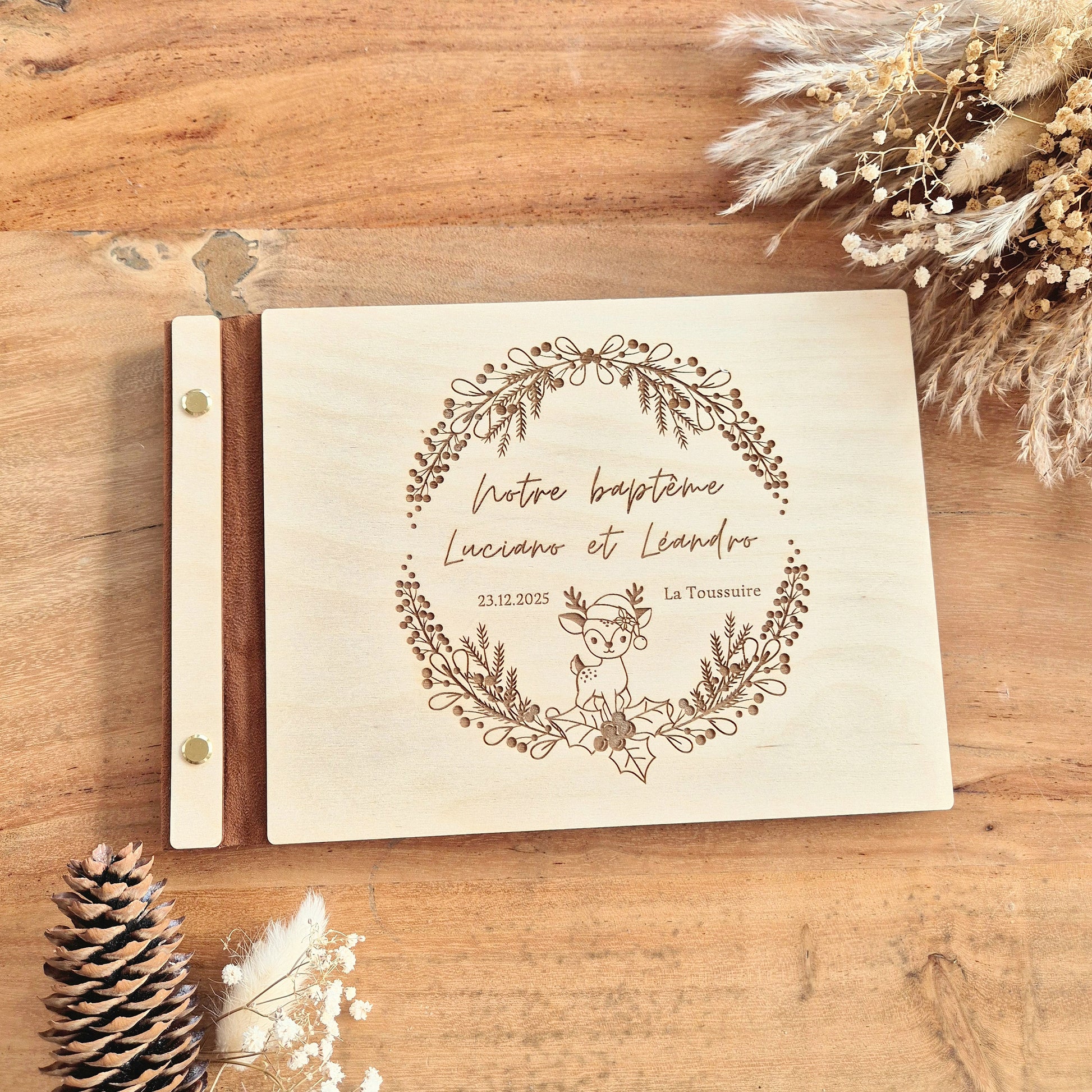 Gardez un précieux souvenir de son baptême avec le livre d'or en bois personnalisé.