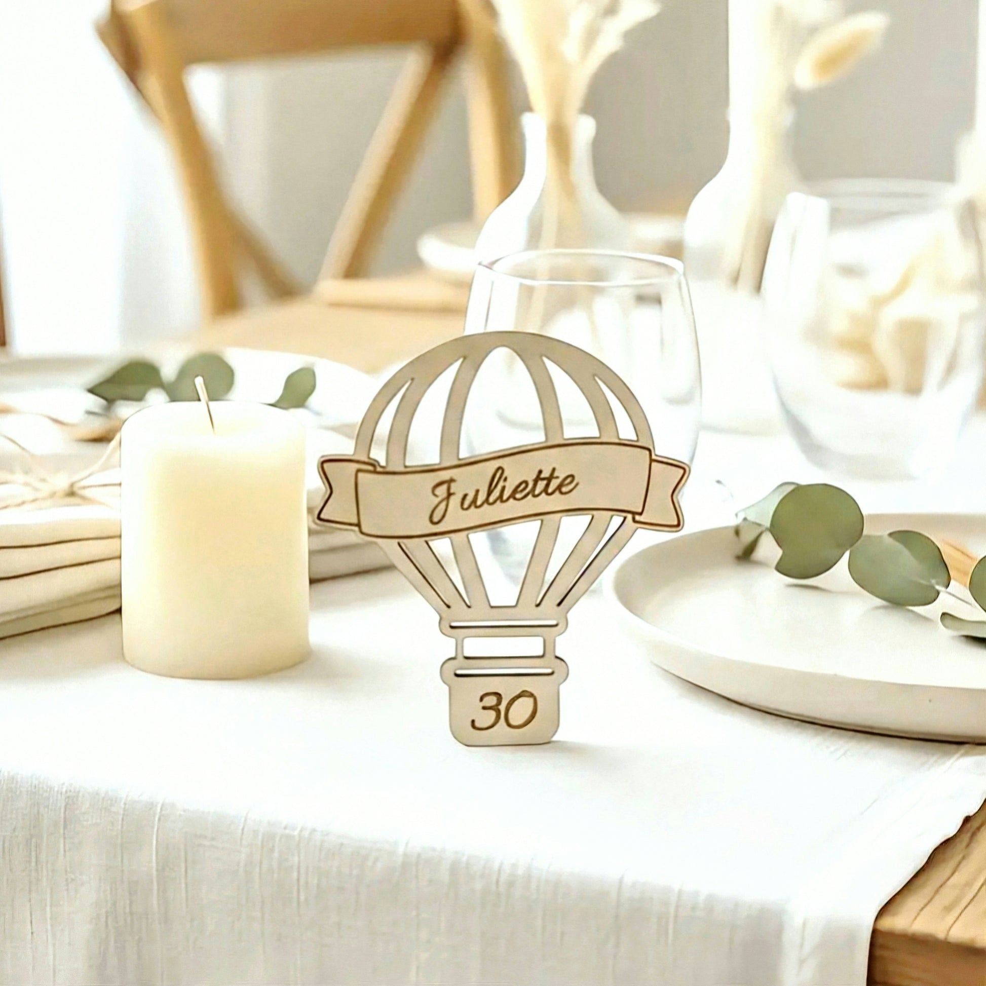 Ce marque place en bois en forme de montgolfière apporte une touche délicate et poétique à votre décoration.