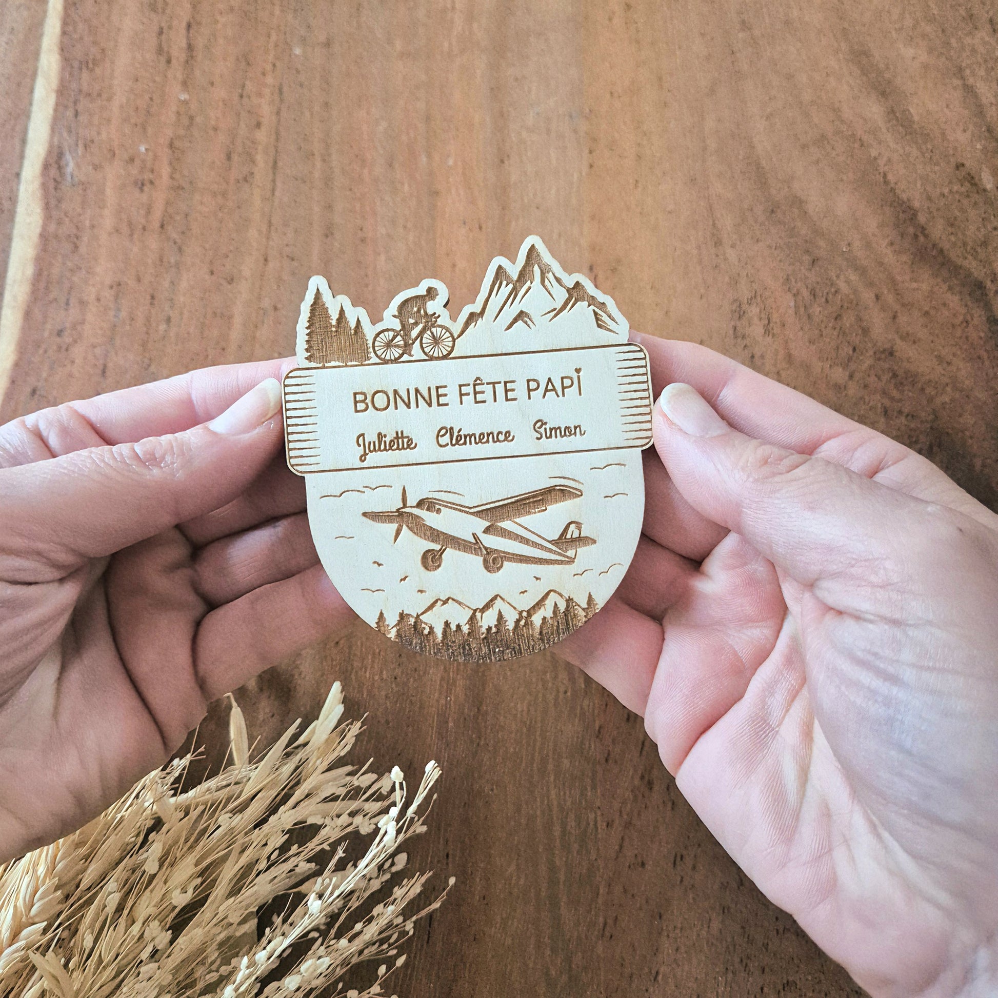 Un magnet en bois créé sur-mesure, pour un Papi passionné de vélo et d'aviation. Un cadeau unique pour sa fête !