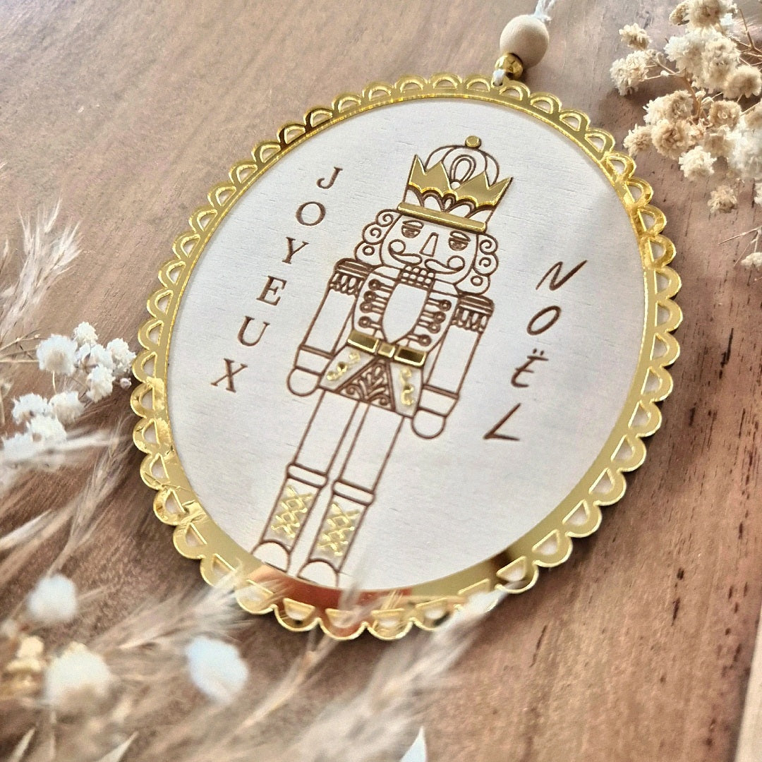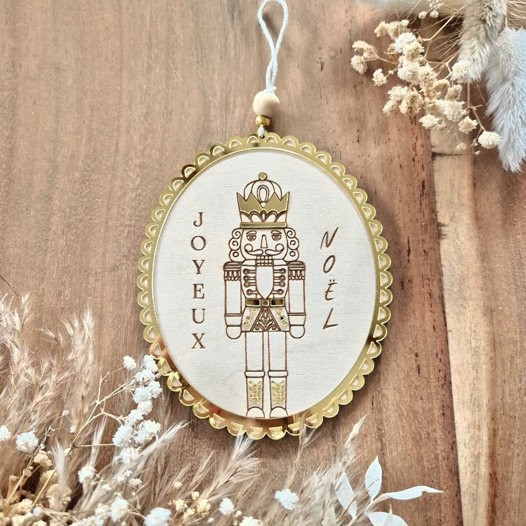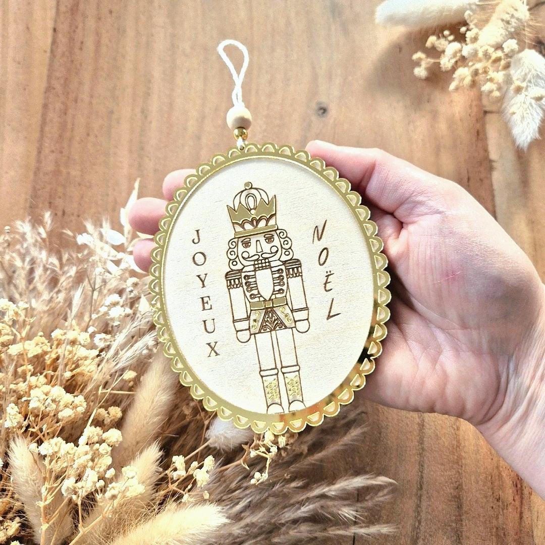 Symbole intemporel de la féérie de Noël, ce Casse-Noisette se dresse fièrement au cœur d’un médaillon doré, comme sorti d’un conte d’hiver.